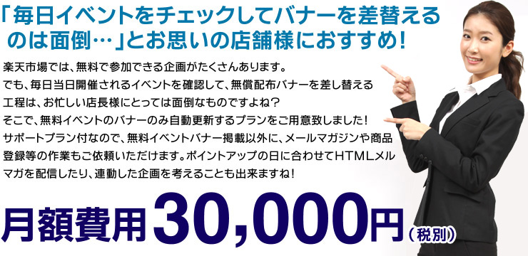 ※作業納期については、基本的には、1作業は着手可能日(お打合せ・データ等のご提供完了)から1〜3営業日にて提出させていただきます。但し、複数制作物を同時にご依頼いただく場合は、この限りではございません(追加日数を要します)ので、作業ご依頼の都度、担当者とご相談をお願い致します。 ※イベントバナー更新以外に、1カ月当たり20,000円相当の作業ボリュームは対応させていただきます。作業ボリュームが20,000円を超過する場合は、別途ご注文書・ご請求書を発行させていただきますので、追加のご注文お手続きをお願い致します。 ※無料イベントバナーは、平日(土・日・祝日及び弊社休業日を除く)の9時〜10時、13時〜14時、16時〜17時に、手動及び目視確認にて元データを更新致します。店舗様には元データを表示するフレームを掲載させていただきます。こちらの時間帯に開始しているイベントを掲載し、終了しているイベントを削除致します。例えば、土曜日の朝9時59分に終了するイベントは、翌営業日の9〜10時の更新までページ上に残ることになりますので、予めご了承くださいませ。尚、弊社長期(3日以上)休暇をいただく際には、前日の16時〜17時の更新時に、全ての無料イベントバナーを削除致しますので、予めご了承くださいませ。 更新作業は楽天GOLDのサーバー上にて行います。楽天GOLDサーバーの更新遅延及びサーバートラブルについては、弊社でのサポート対象外とさせていただきますので、予めご了承くださいませ。 ※ご契約は6ヶ月単位とさせていただきます。ご契約時に前入金とさせていただきますので、作業ご依頼毎のご注文書のご記入・ご送付やお振込お手続き等は不要です。 ※ご依頼内容がお決まりでない場合は、企画のご相談・弊社からのご提案等もさせていただきます。但し、こちらはコンサルティング契約ではございませんので、売上アップやアクセス数増加の保障をするものではございません。予めご了承くださいませ。 ![]() |